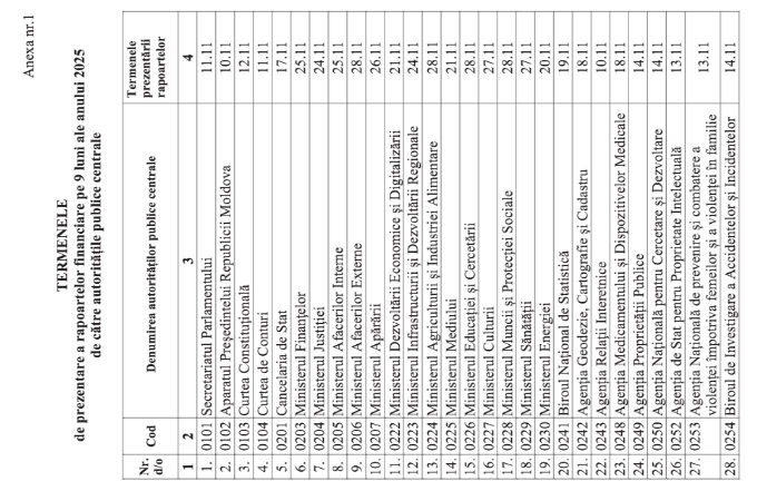 Ministerul Finanțelor a publicat în Monitorul Oficial din 2 octombrie curent Ordinul nr. 101 din 29 septembrie 2025 cu privire la aprobarea termenelor de prezentare a rapoartelor financiare pe 9 luni ale anului 2025.