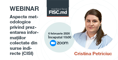 P.P. „Monitorul Fiscal FISC.md”, organizează webinar GRATUIT cu genericul: „Aspecte metodologice privind prezentarea informațiilor colectate din surse indirecte (CISI)”...