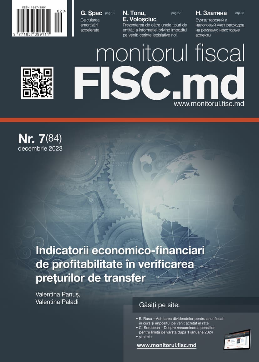 În ultima perioadă tot mai frecvent se discută despre prețurile de transfer, dat fiind faptul că, în conformitate cu Codul fiscal, noile prevederi urmează a fi puse în aplicare din 1 ianuarie 2024. În acest sens, în ediția din decembrie a revistei „monitorul fiscal FISC.md”, Valentina Panuș și Valentina Paladi analizează indicatorii economico-financiari de profitabilitate în verificarea prețurilor de transfer, într-un articol publicat în rubrica Contabilitate practică.